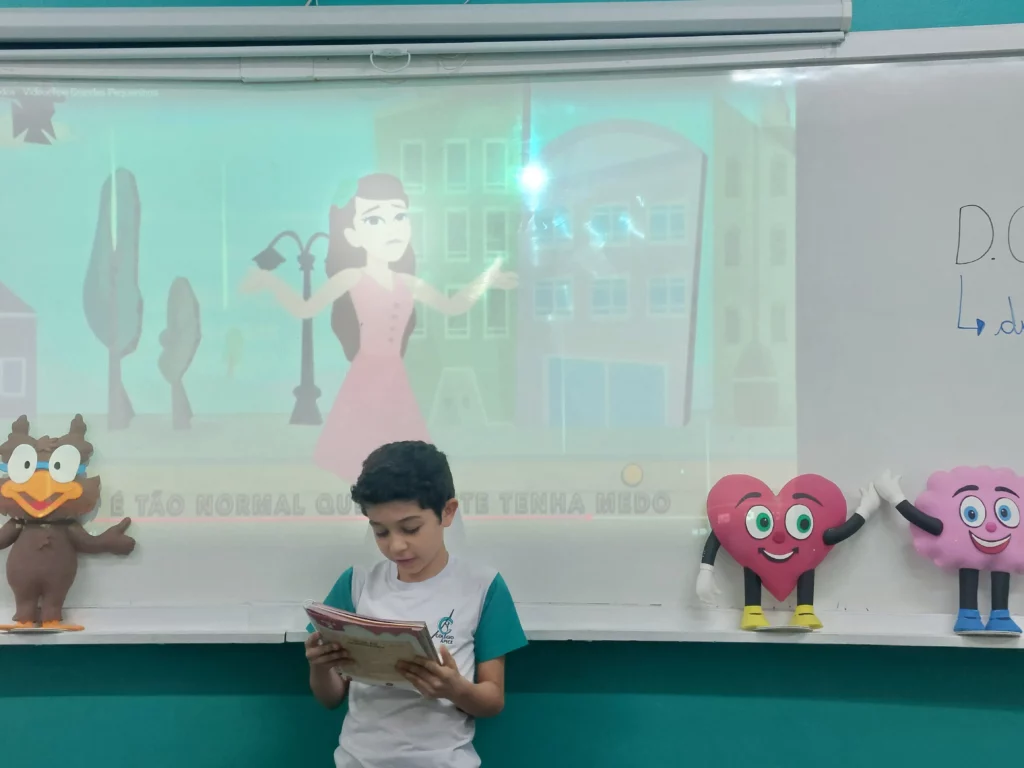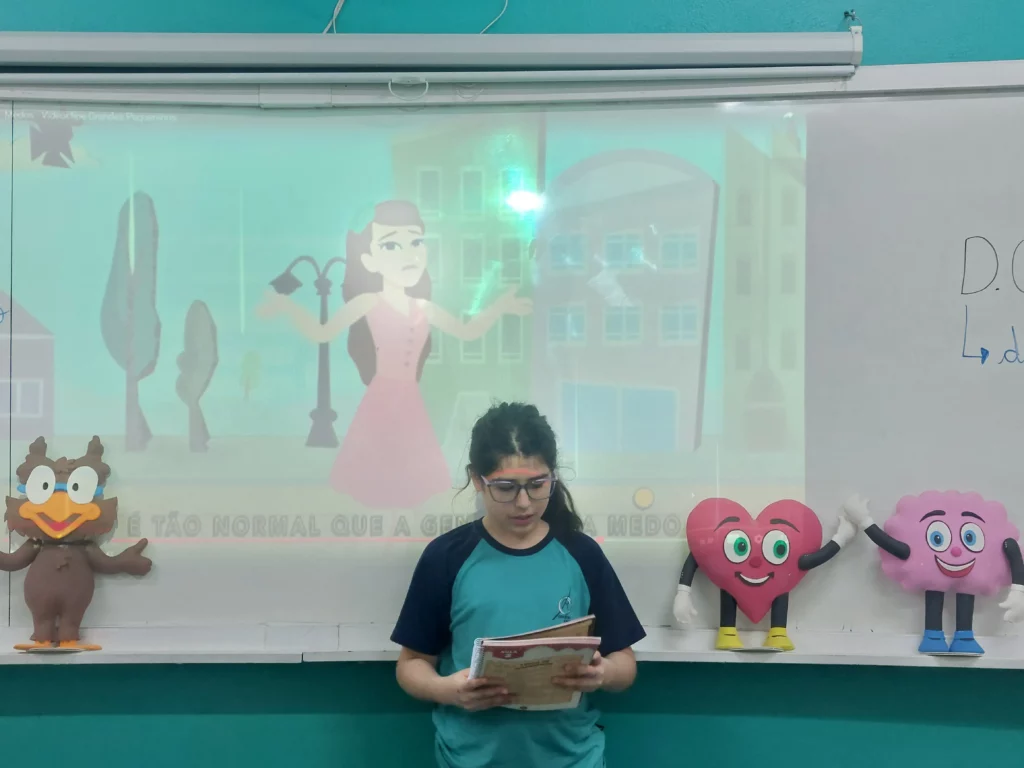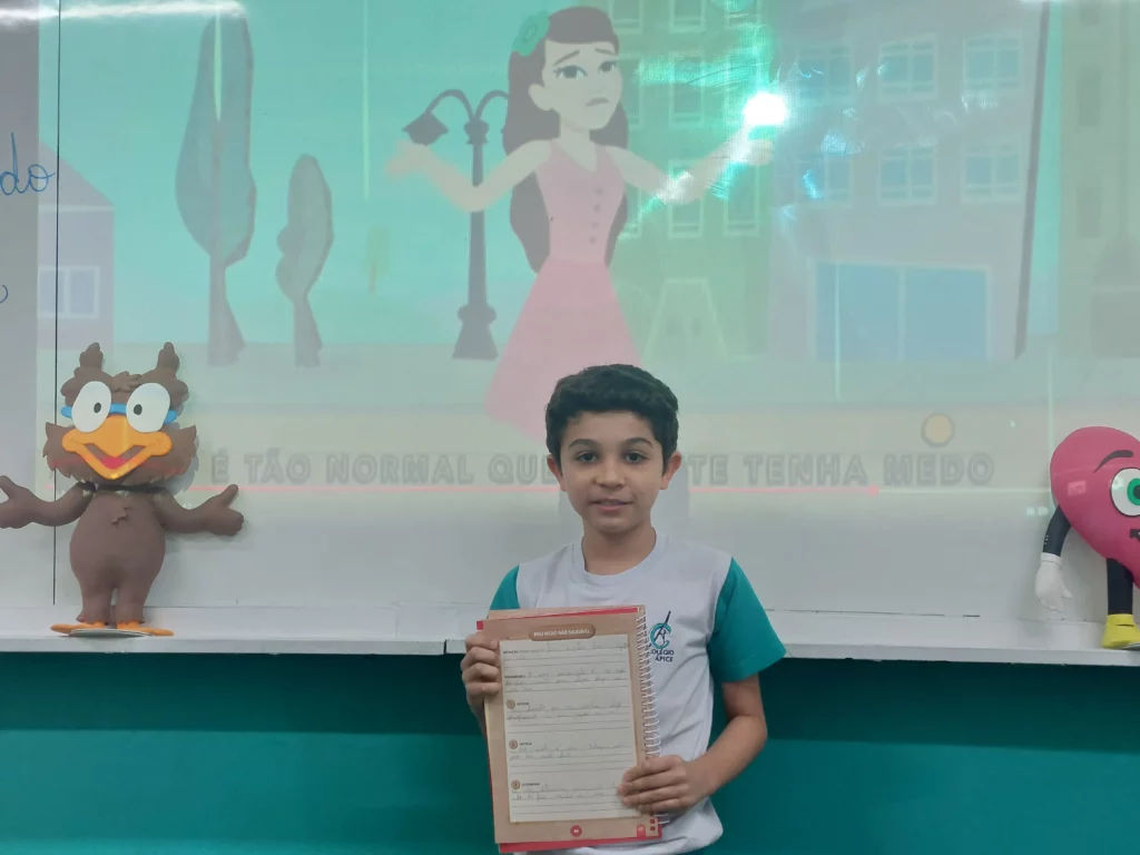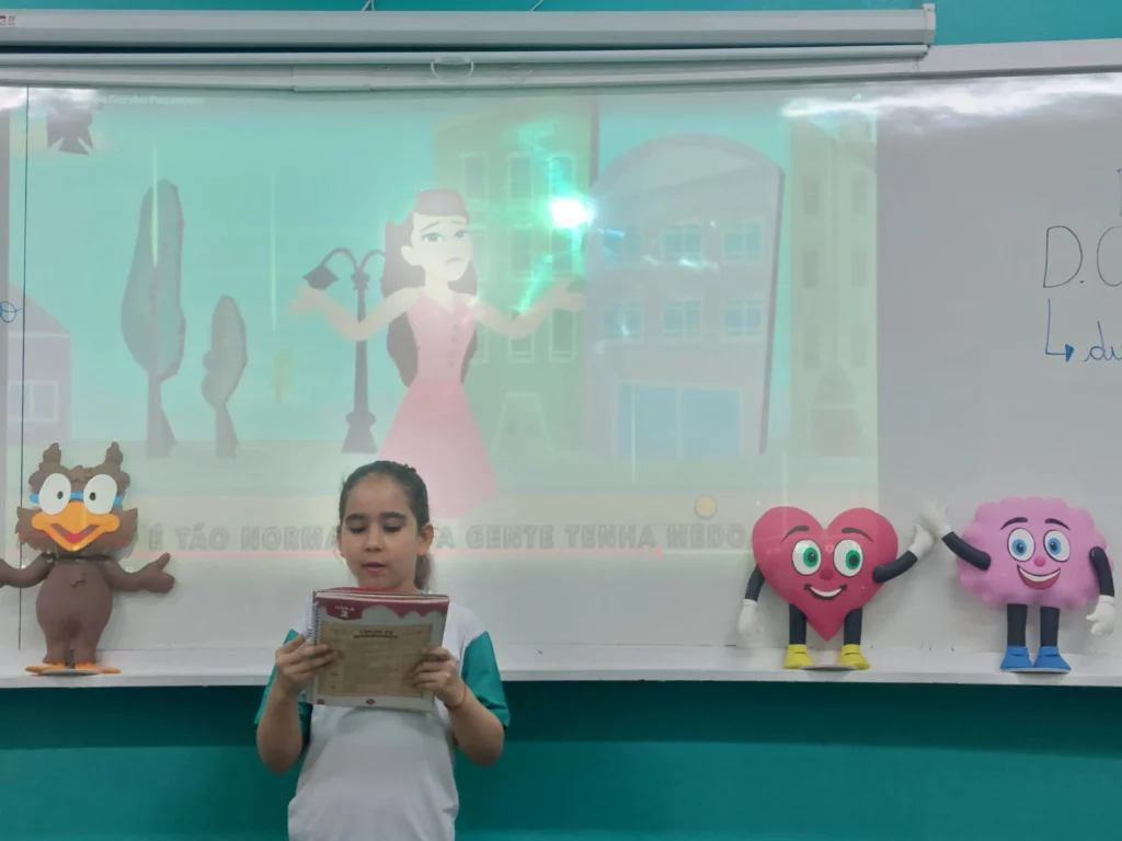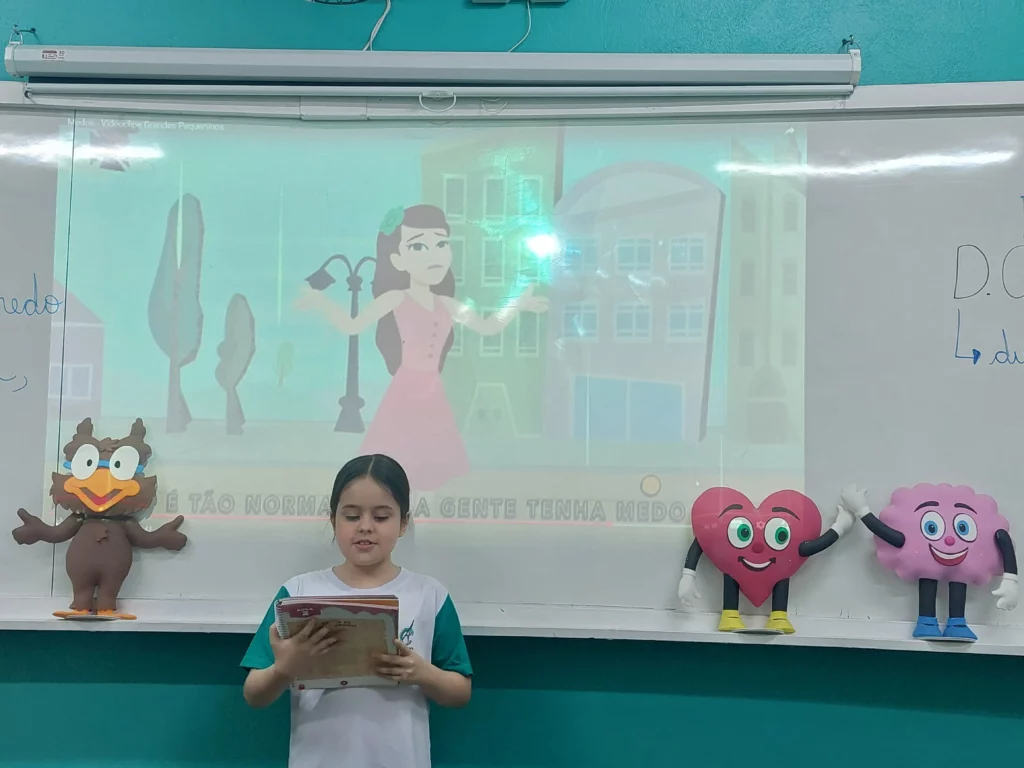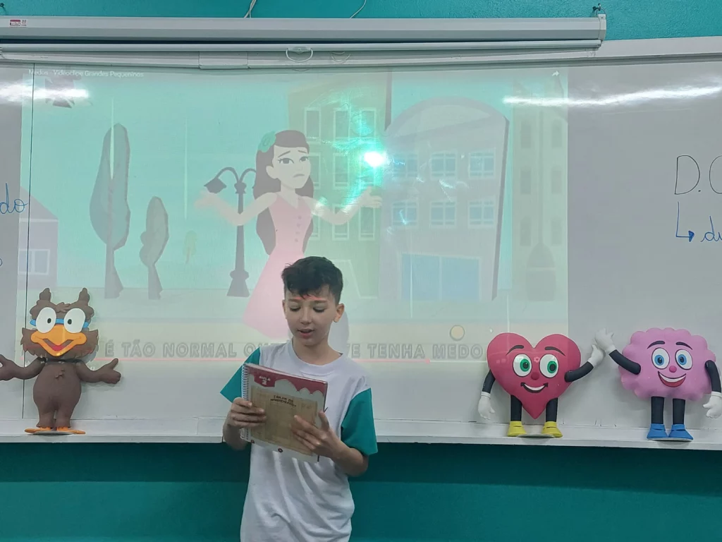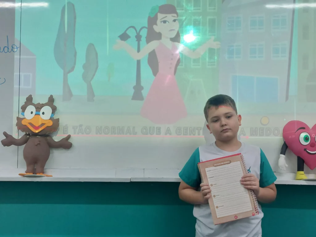 Nas aulas de Valores e princípios, em que as turmas do 4º ano tiveram o material da Escola da Inteligência com a Professora Alessandra Castilho, houve a possibilidade de explorar as variadas emoções em propostas interessantes, tais como o Bairro Medo. Ouvir histórias, refletir sobre a emoção, verbalizar situações em que envolve o que sentem diante do medo, entre outras propostas contribuíram para que cada criança pudesse analisar as próprias atitudes, transformando-as gradativamente nas mais saudáveis possíveis no determinado momento.