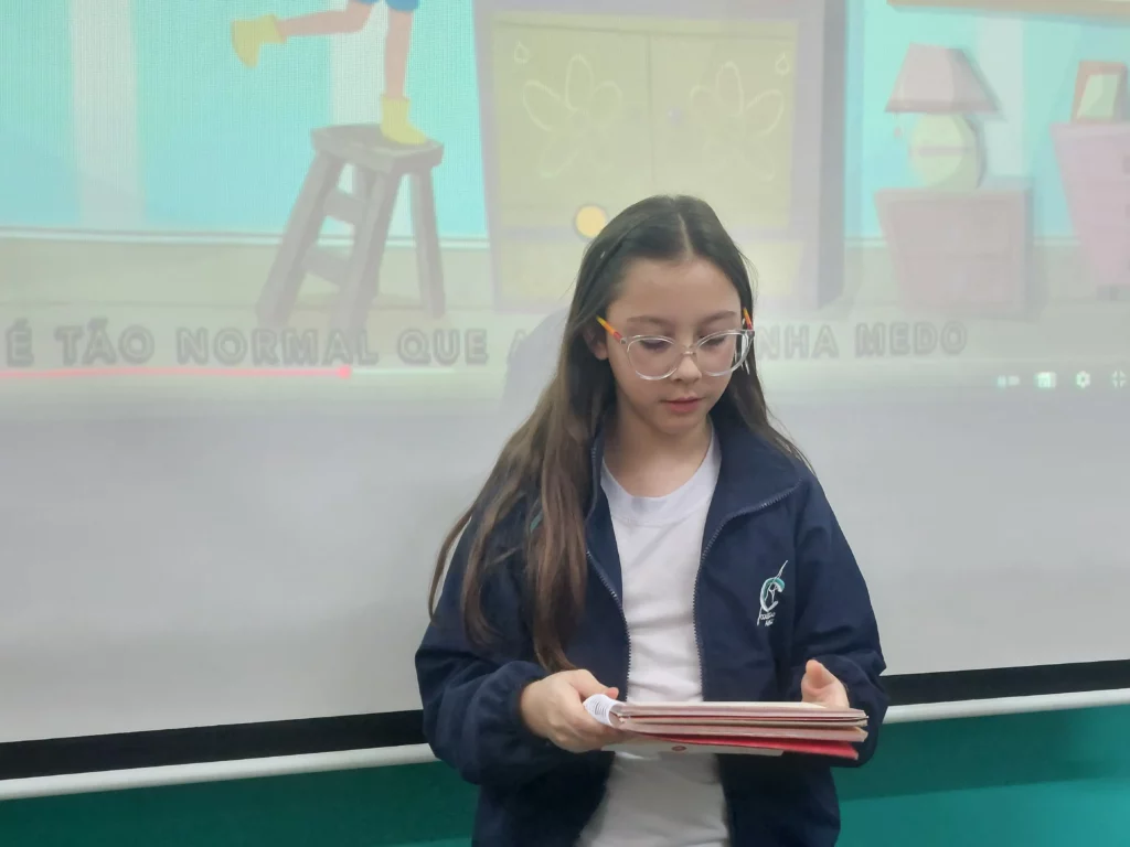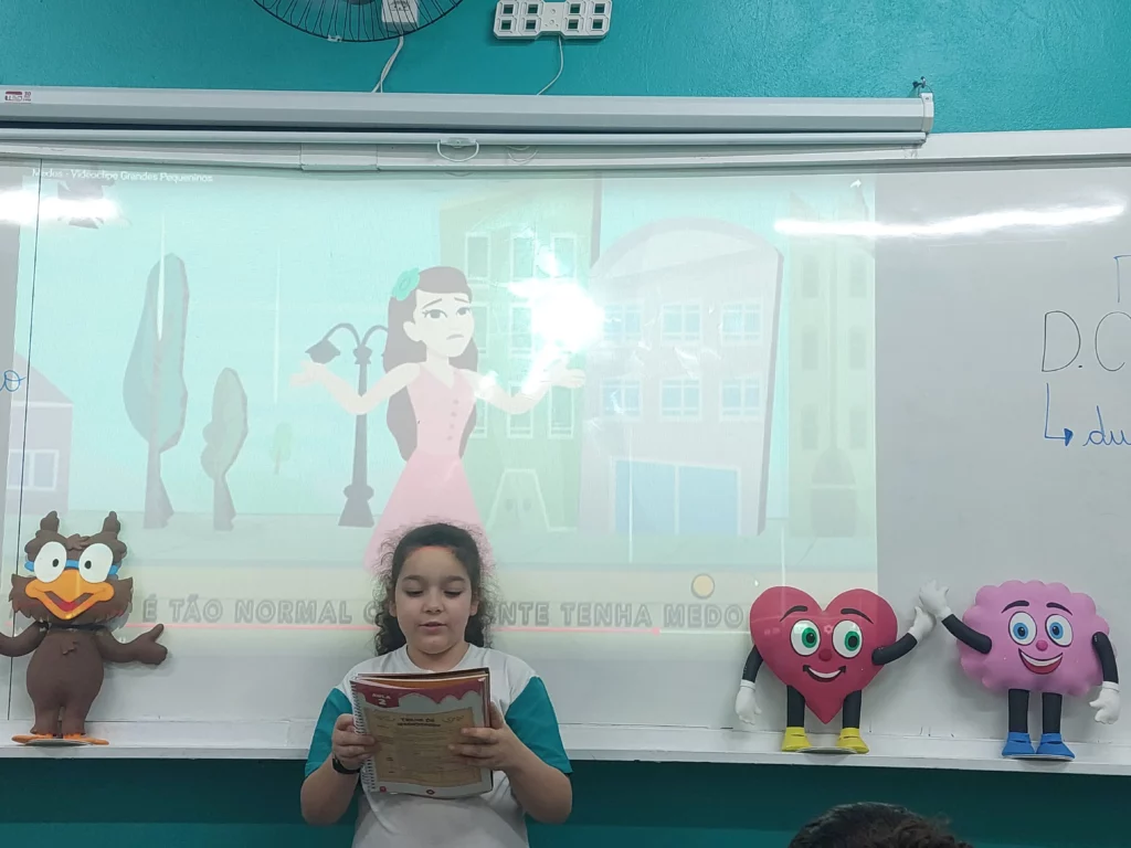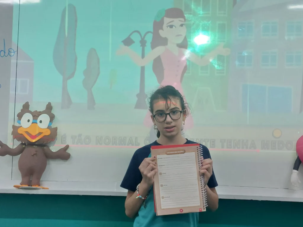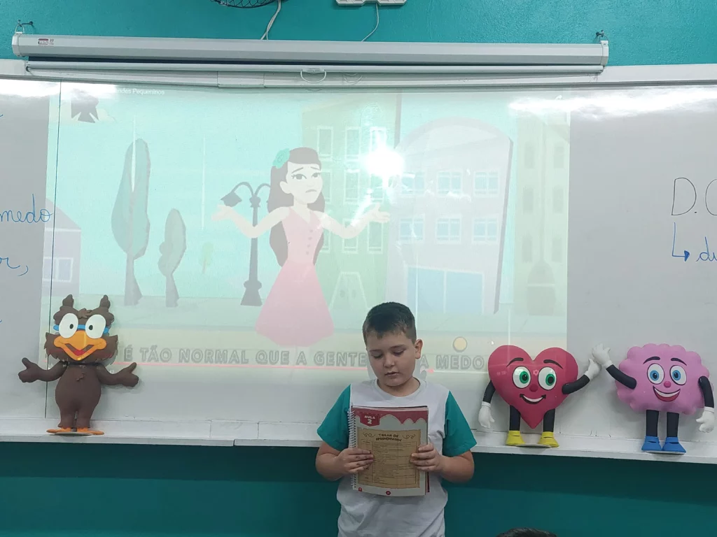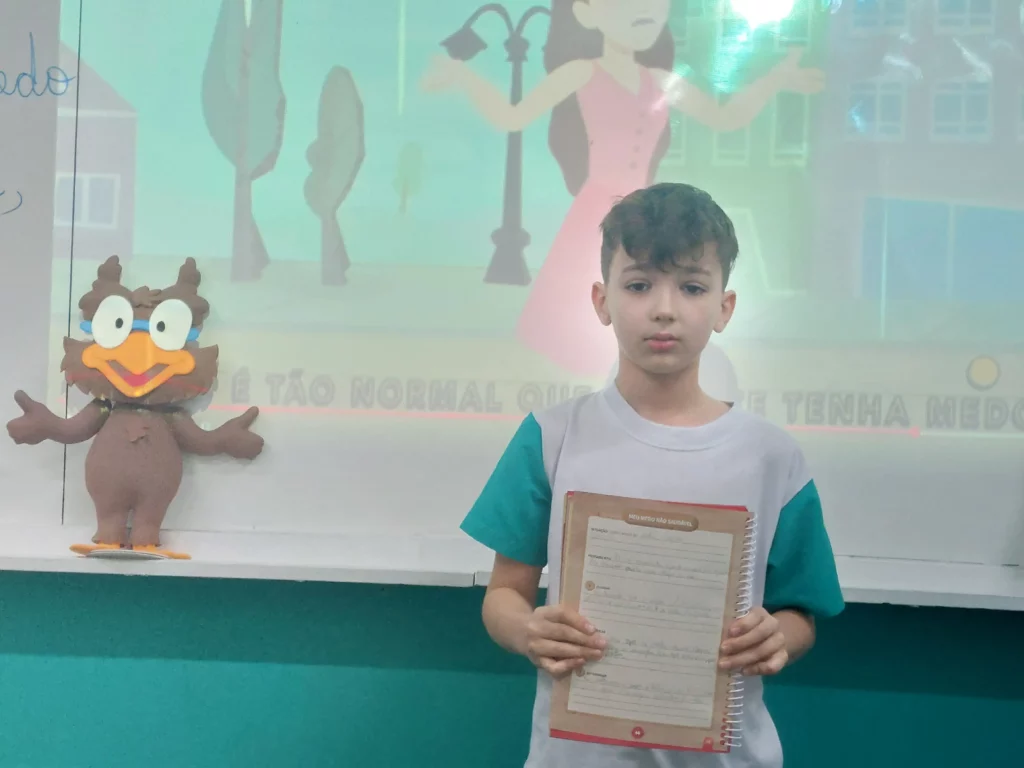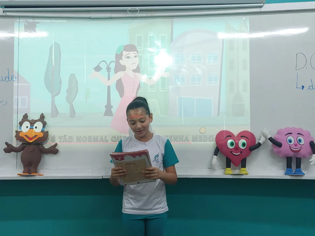 Nas aulas de Valores e princípios, em que as turmas do 4º ano tiveram o material da Escola da Inteligência com a Professora Alessandra Castilho, houve a possibilidade de explorar as variadas emoções em propostas interessantes, tais como o Bairro Medo. Ouvir histórias, refletir sobre a emoção, verbalizar situações em que envolve o que sentem diante do medo, entre outras propostas contribuíram para que cada criança pudesse analisar as próprias atitudes, transformando-as gradativamente nas mais saudáveis possíveis no determinado momento.